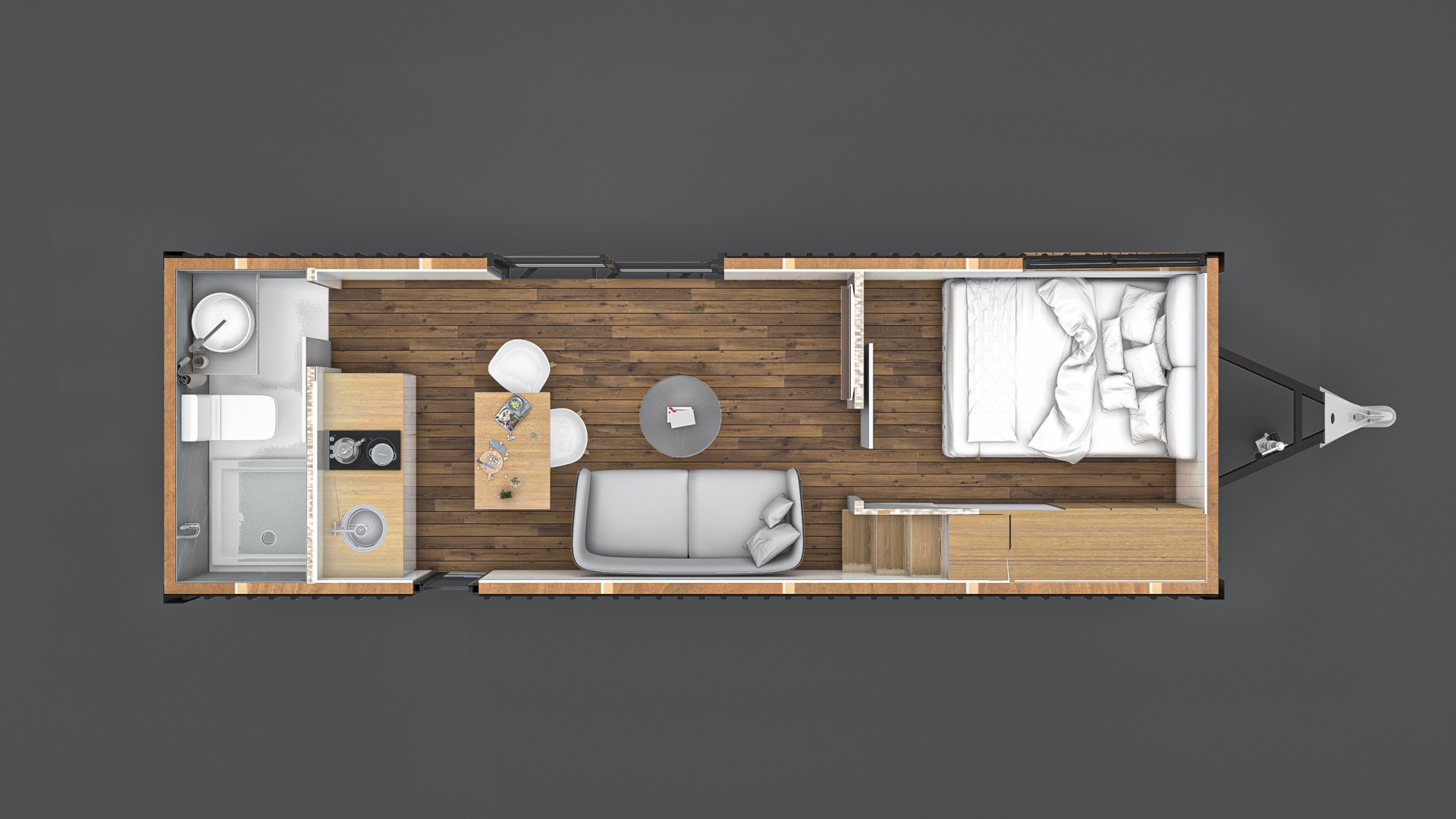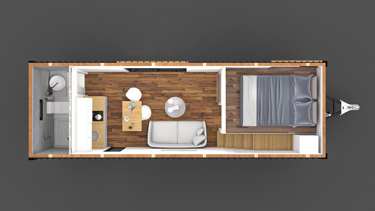 Geniş bir salon ve adalı mutfak alanı ile bu fonksiyonel tasarlanmış tiny house tasarımına göz atın ve banyoda ustaca alan kullanımını keşfedin. Zemin katta ferah bir salon mutfak ve yatak odasından oluşmaktadır. İyi çözümlenmiş merdiveni ile loft kattaki yatak odasına erişim sağlamaktadır.